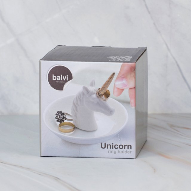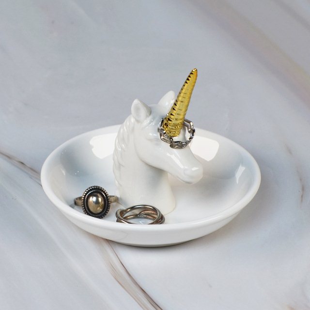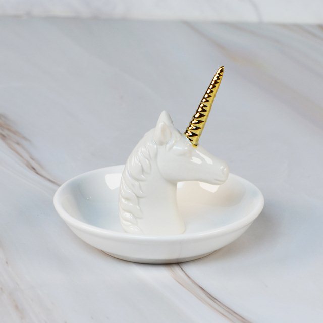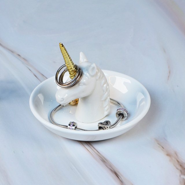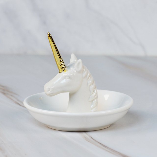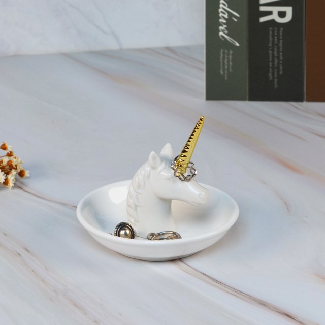 這款獨角獸造型戒指收納盤,以亮白陶瓷搭配金色獨角,呈現出精緻又夢幻的視覺效果。獨角的立體設計可用來套放戒指,讓常用飾品隨手取用;下方的圓盤則提供額外的空間收納耳環、手鏈或其他小物,保持桌面整潔。